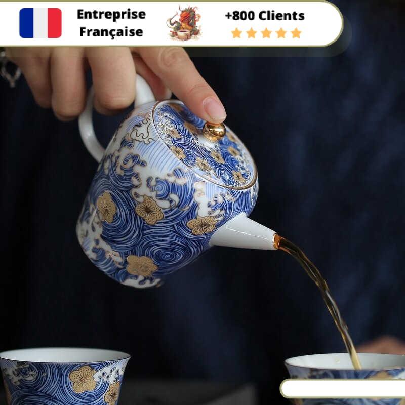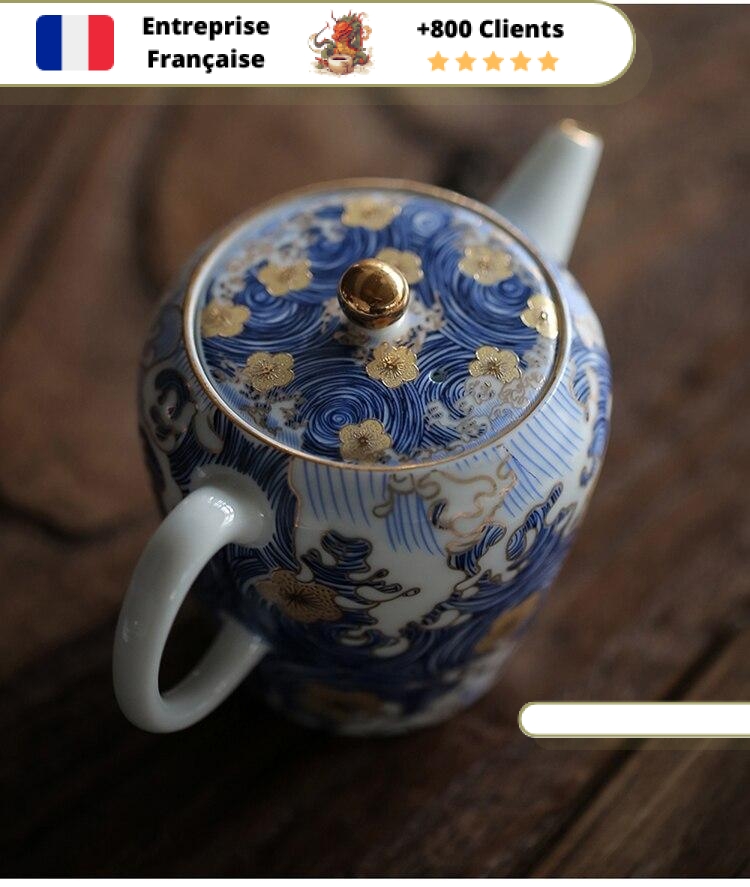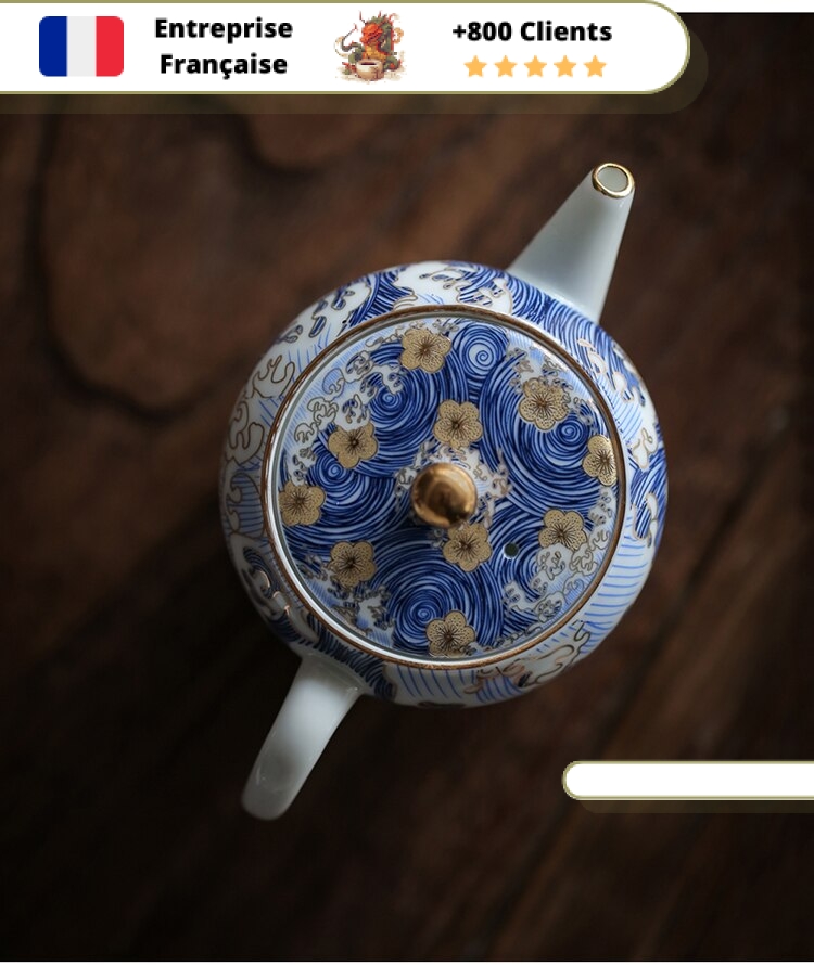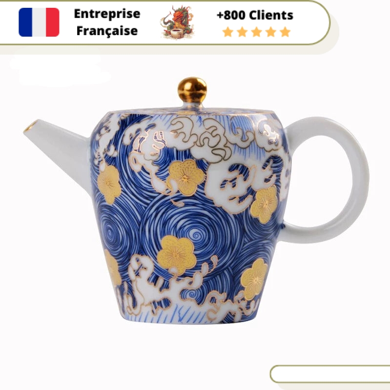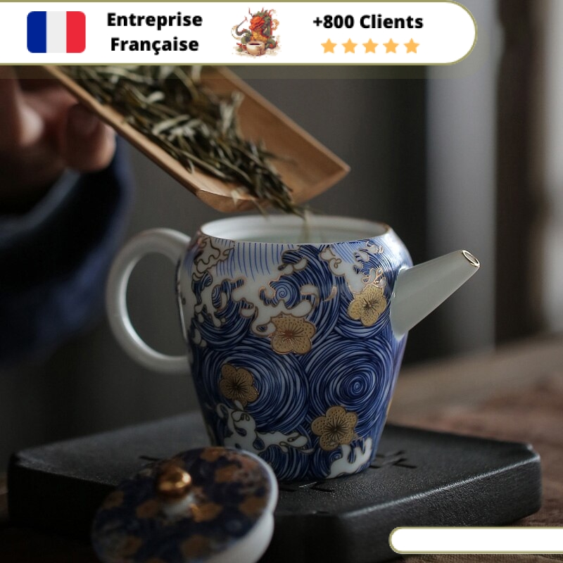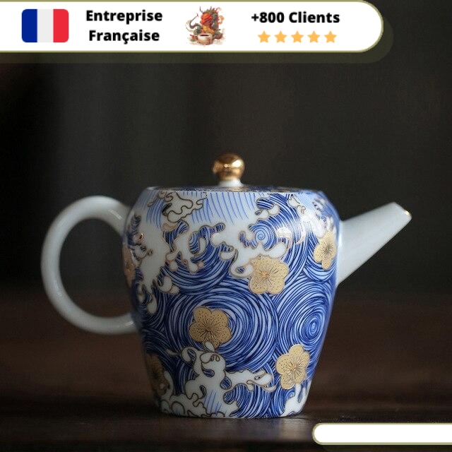 Cette Petite Théière en Porcelaine est le symbole même de la délicatesse et de la beauté. Son motif japonais de vague et fleur, sa porcelaine fine sans mémoire, son filtre intégré et sa contenance de 160ml (0,16L) en font une pièce exceptionnelle pour tester et déguster tous les thés que vous souhaitez.